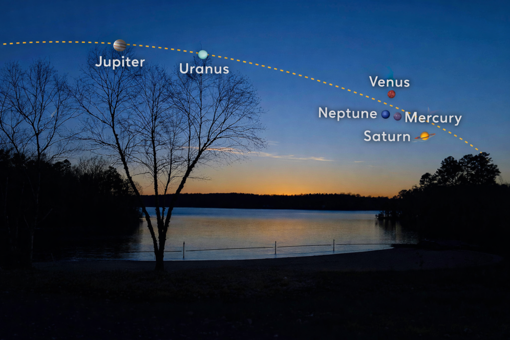 To see the planet parade, look toward the western horizon shortly after sunset. Find a location with minimal light pollution and avoid trees or buildings blocking your view. Planets shine with a steady light, unlike stars which appear to twinkle.