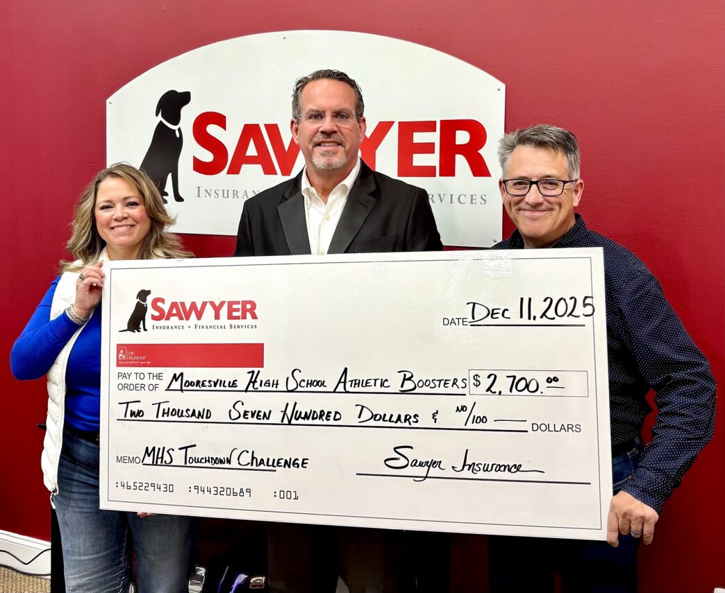 In partnership with the Mooresville High School Athletic Booster Club, Sawyer Insurance pledged $200 for every touchdown scored by the varsity team during home games for the 2025 season, with all proceeds split equally between the MHS Athletic Booster Club and Mooresville Christian Mission.
