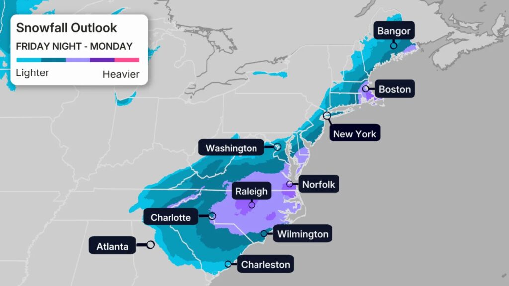 Where snow ends up — and how much falls — largely depends on the storm’s exact track. A track closer to the coast would push heavier, wind-driven snow further inland, while a shift farther offshore could reduce inland snowfall but still create hazardous marine conditions.