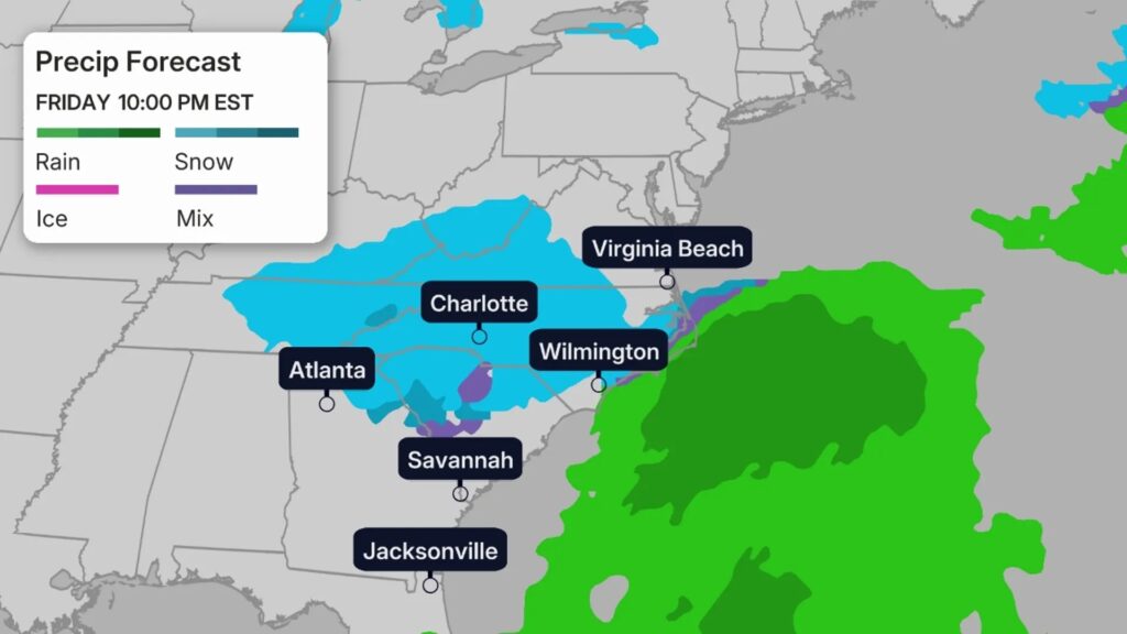 - Friday night: Snow begins in parts of the Southeast as a low-pressure system organizes offshore.